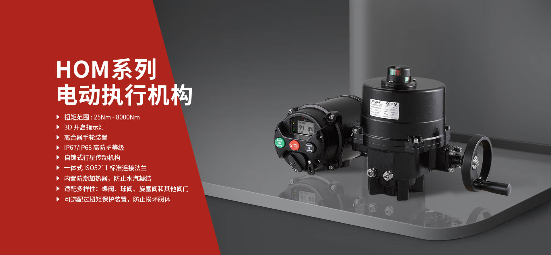 HOM系列帶行星齒輪的部分回轉(zhuǎn)電動執(zhí)行機(jī)構(gòu),用于機(jī)械傳動。輸出扭矩為25~8000NM,無離合器手動操作。手動和電動分別操作。它在沒有手柄或離合器的情況下很容易操作,當(dāng)電源打開時,你可以轉(zhuǎn)動手輪。電動執(zhí)行機(jī)構(gòu)可與蝶閥、球閥、旋塞閥組合,廣泛應(yīng)用于發(fā)電廠/冶金廠/污水處理廠/樓宇自動化/城市管網(wǎng)等管道系統(tǒng)